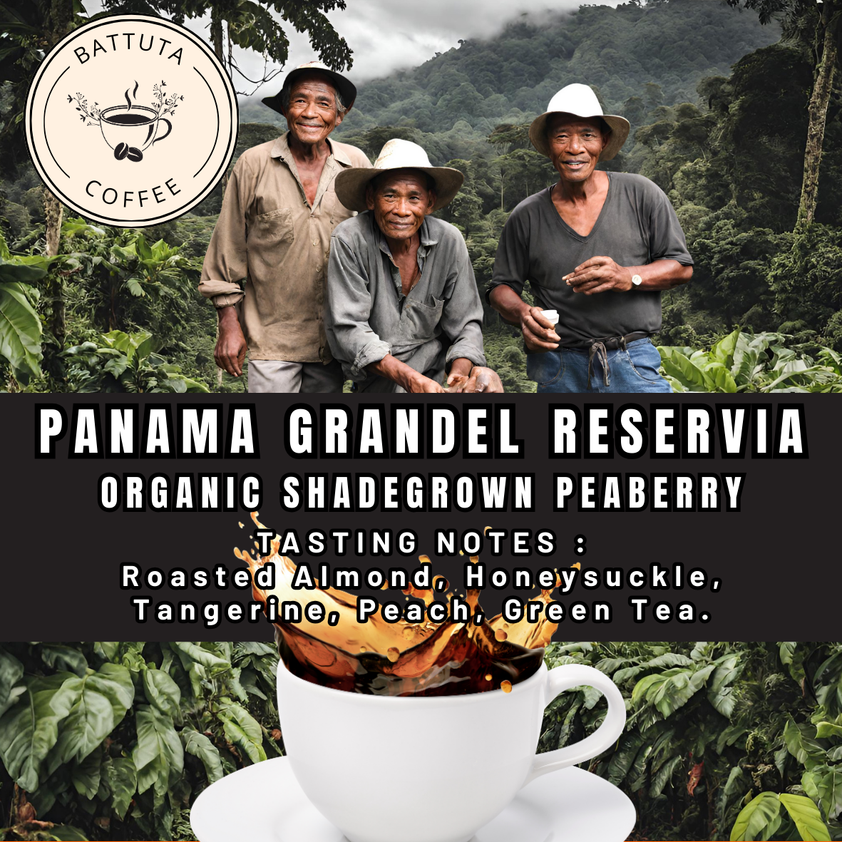 🌿 Indulge in the exquisite taste of Panama Grandel Reservia shade-grown peaberry coffee. 🌳 Our beans, nurtured under the lush canopy of bird-friendly shade, offer a sweetness unique to the Central American terroir. ☕ With a longer cultivation period, each sip unveils notes of roasted almond, honeysuckle, peach, tangerine, and green tea, elevating your coffee experience to new heights. 🍑🍵 Explore the micro-region's coastal influences, where cool nights and sun-drenched days converge to craft perfection at 4700 ft. above sea level. 🌊 Embrace sustainability with our single-origin, 100% organic brew, supporting the Latin American Coffee Growers' Cooperative. 🌍 Indulge in luxury, sip with purpose.